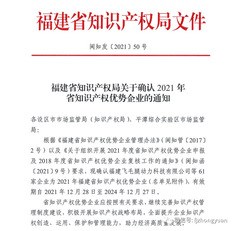 12月,我們正式成為“福建省知識產(chǎn)權(quán)優(yōu)勢企業(yè)”中的一員。